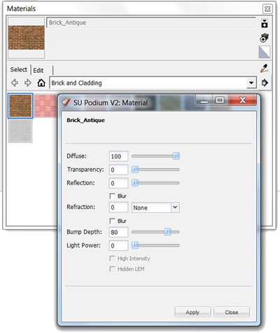 自動マテリアルの動作(Sketchupの標準マテリアルに対して)自動マテリアルがオンの場合、Podiumは、モデルに含まれるSketchup標準マテリアルの名前を認識し、自動的に、あらかじめ定義された反射、ぼやけ、拡散、バンプを適用します。Podiumのプロパティは、Catalogの開発者やテスターによって、あらかじめ定義されています。 Podiumプロパティが適用されるSketchup標準マテリアルの一覧は、materials.csvファイルをご覧ください。materials.csvファイルは、SU_Podium_V2 \presetフォルダにあります。materials.csvは、編集しないでください。自動マテリアルが適切に動作しなくなる場合があります。 Podiumは、Sketchup標準マテリアルの名前を認識すると、materials.csvファイルで定義されたPodiumプロパティを適用します。例えば、SketchUpのBrickやCladdingカテゴリに属するbrick_antiqueマテリアルは、自動的に、バンプ値80に設定されます。